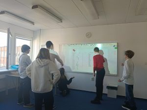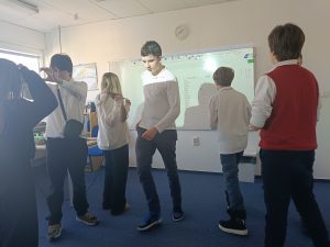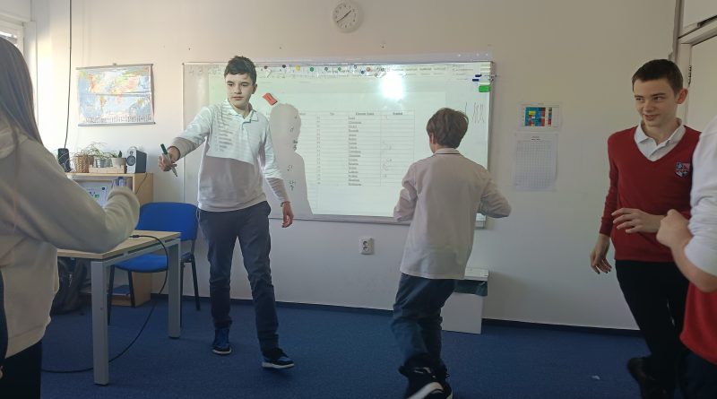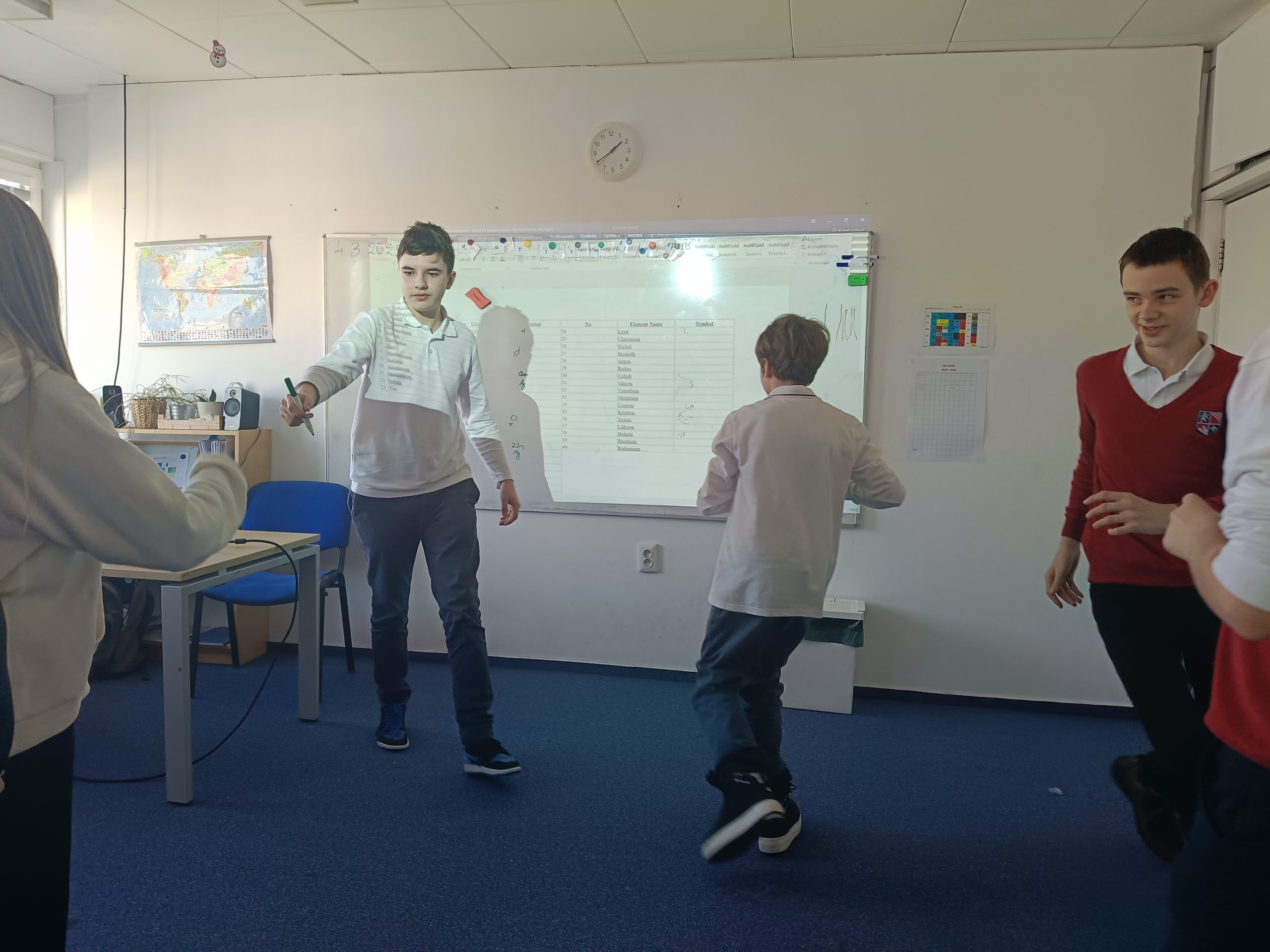 Students were paired into two small groups and challenged to match as many chemical symbols as possible with their corresponding element names. This friendly competition created an exciting atmosphere, motivating students to recall and apply their knowledge quickly. After an intense session, the group consisting of Alica, Zlata, Valentin, and Alex won, closely followed by Jack, Daniil, and Charlie, who also performed exceptionally well.