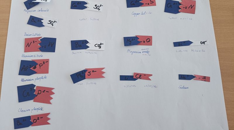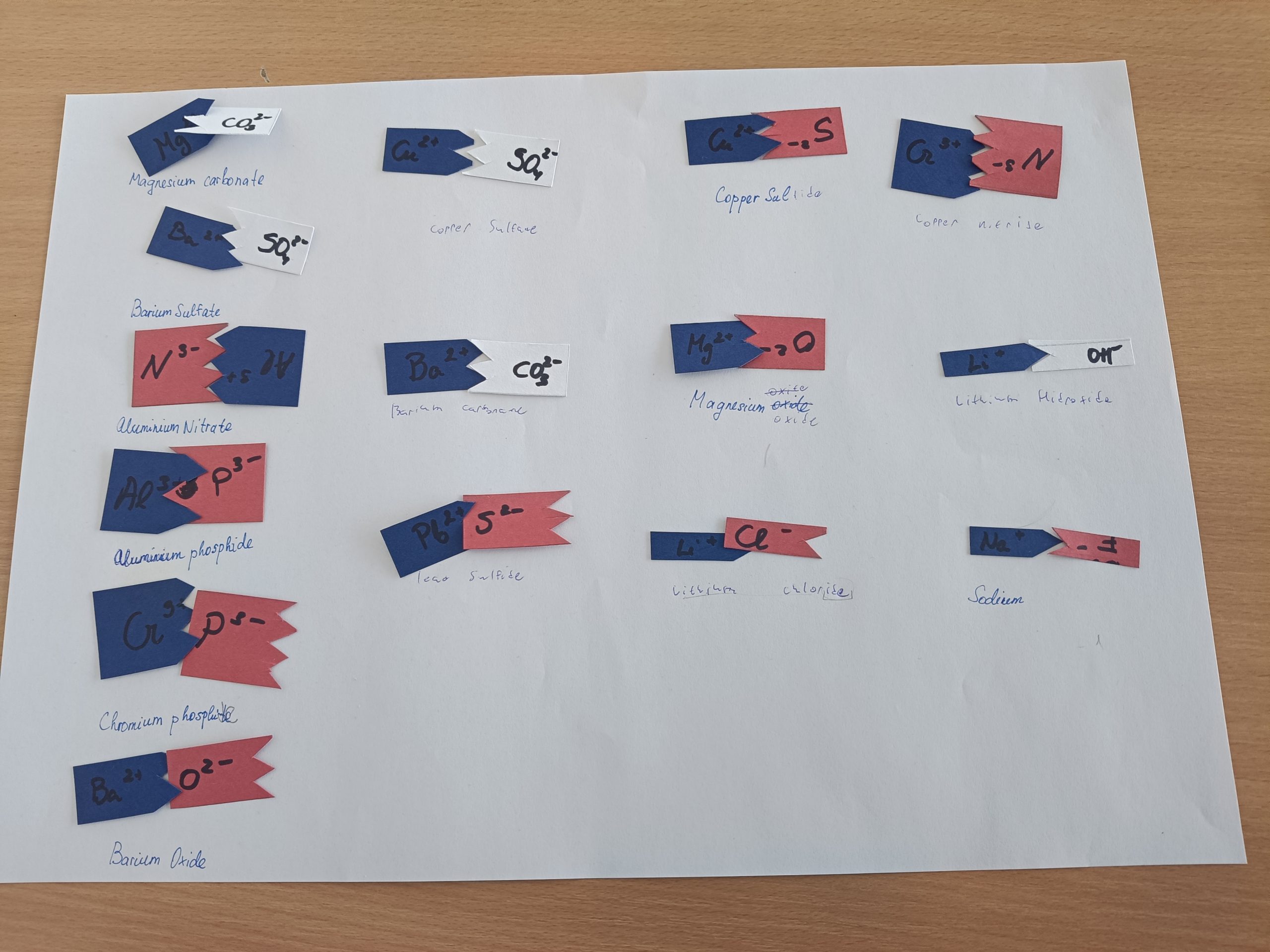 Students worked in groups, combining puzzle pieces representing various ions, ensuring that positive and negative charges balanced correctly to form valid ionic compounds.