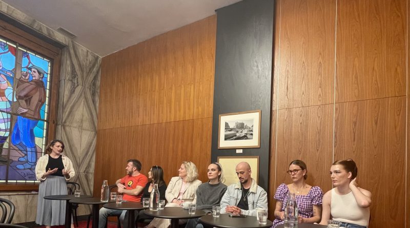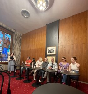 The meeting had a warm, informal atmosphere – over coffee and cake, we had the chance to talk with the theatre’s director, Valeria Schulczová, as well as actresses Zuzana Kronerová, Kristína Tormová, Henrieta Mičkovicová, and others. The discussions were inspiring and offered valuable insights into theatre-making and the importance of dramatic arts for students.