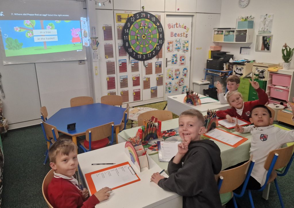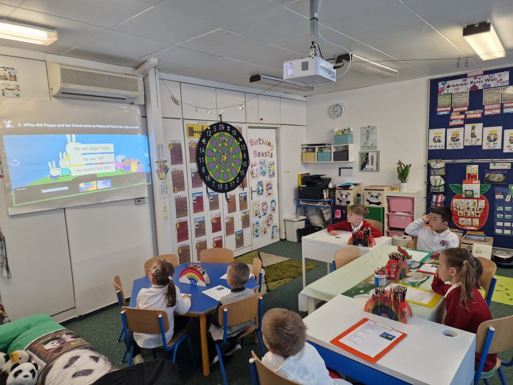 Lower Primary students learned about Easter by watching an interactive quiz video, Peppa Pig’s Easter, which helped them understand Easter traditions in a fun and engaging way. They answered questions together, building their listening and comprehension skills. Afterwards, the children played a vocabulary game to strengthen their Easter word knowledge, making learning enjoyable and meaningful through teamwork and play