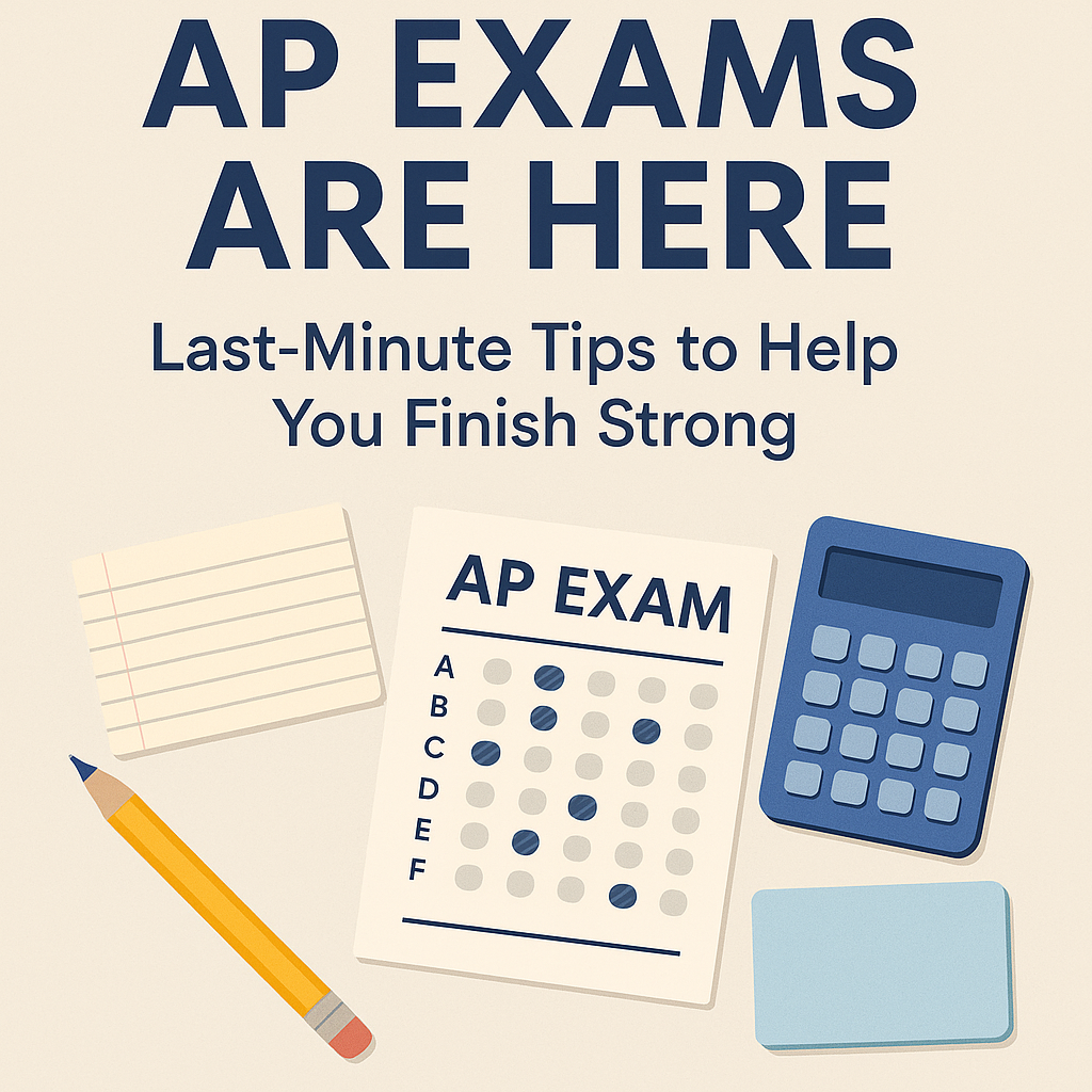 It’s that time of year again—AP exam season is officially underway! Whether you’re walking into your first AP test or you’re a seasoned senior tackling multiple exams, it’s normal to feel a mix of excitement, nerves, and maybe a touch of panic. But don’t worry—there’s still time to sharpen your focus and make sure you’re walking in confident and prepared. Here are some last-minute tips to help you power through AP week like a pro.