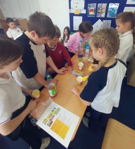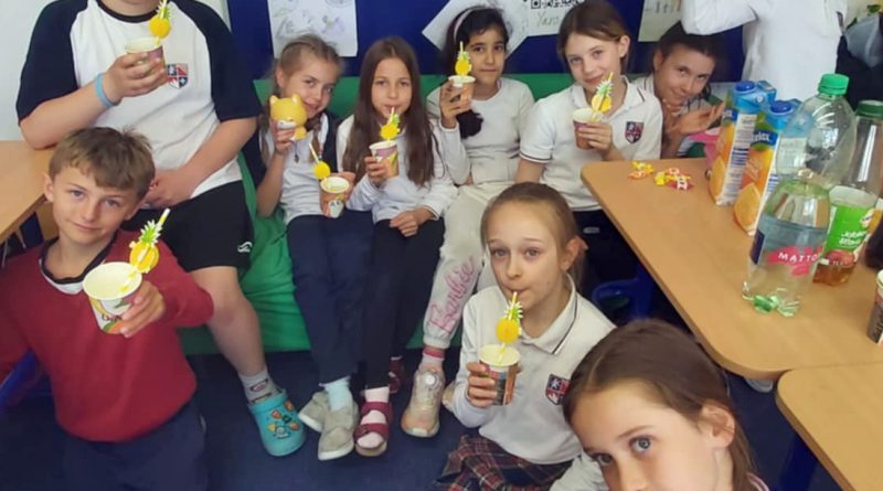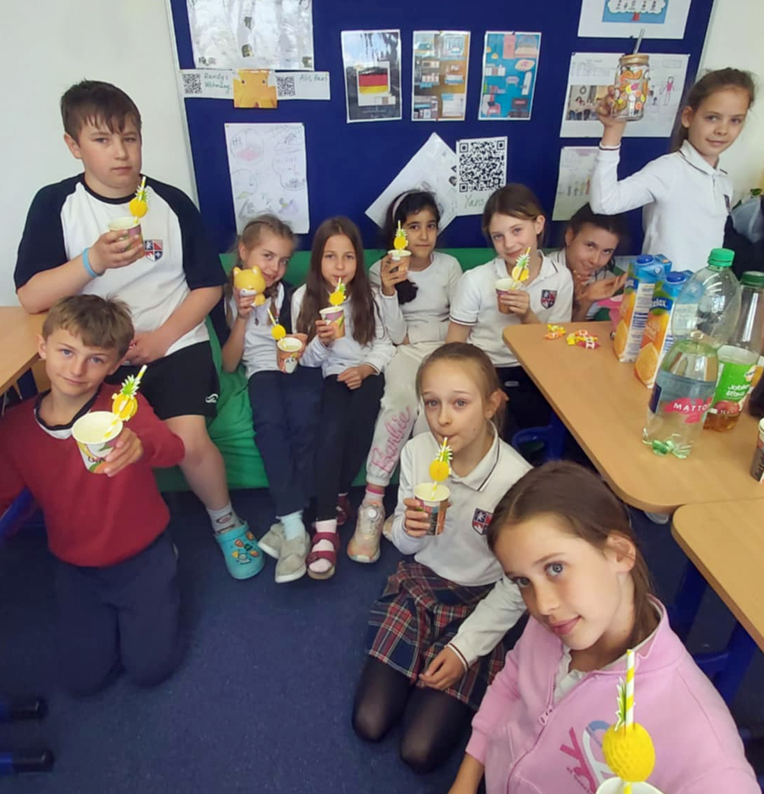 That’s why making real fruit salad or mixing non-alcoholic cocktails is always a hit in our classes! 😄 This time, however, our Year 4 and 5 German students stepped into the roles of shopkeepers and customers in a little classroom marketplace, where they sold refreshing drinks like juices, mineral water, and sweet treats.