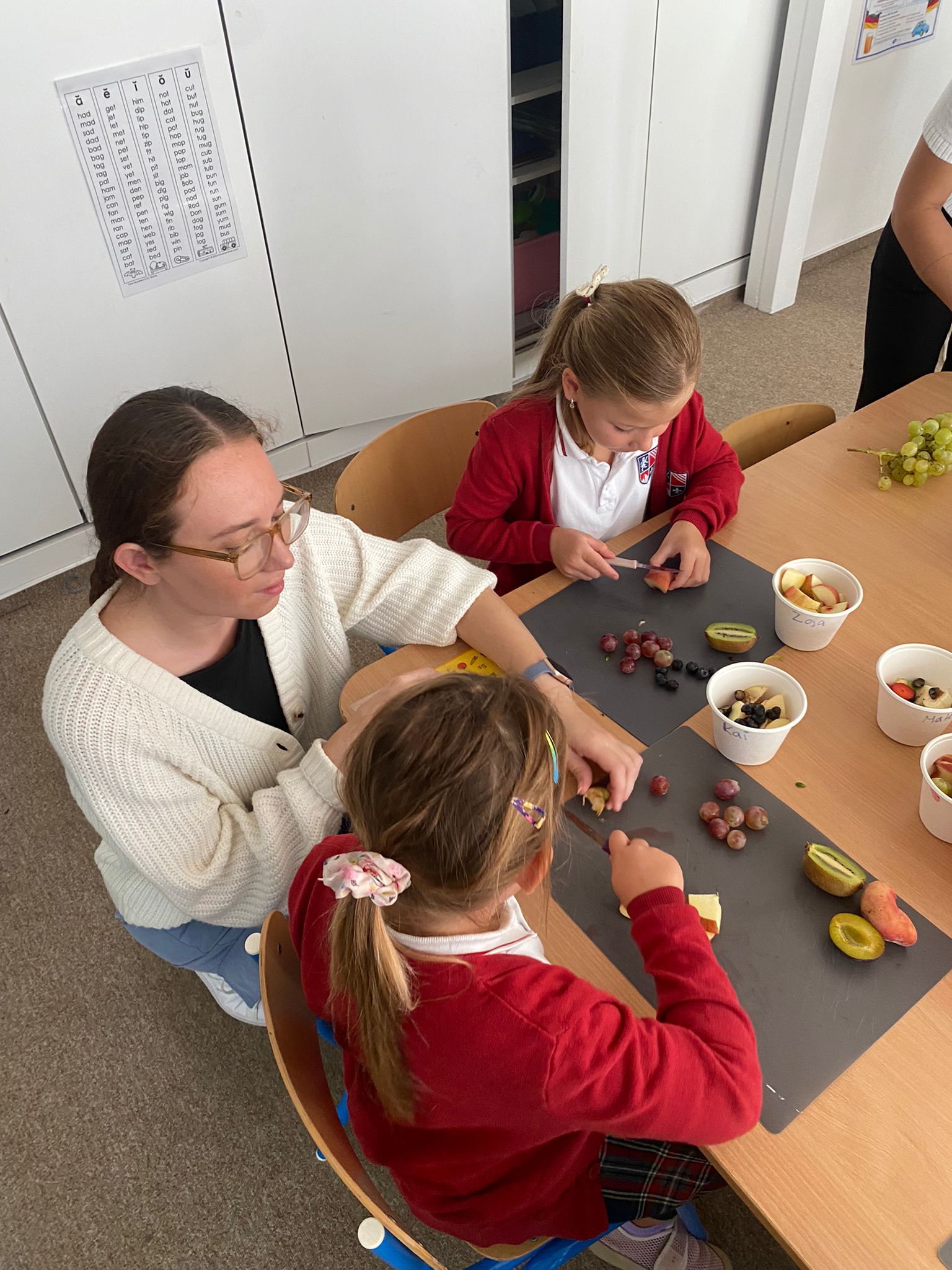The classroom was filled with excitement as students explored a variety of colorful fruits: apples, plums, blueberries, kiwi, grapes, peaches, lemons, and strawberries. Together, we cut, mixed, and prepared a delicious fruit salad that we later enjoyed as a class community.