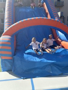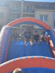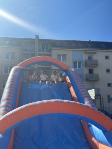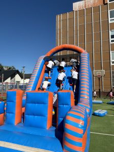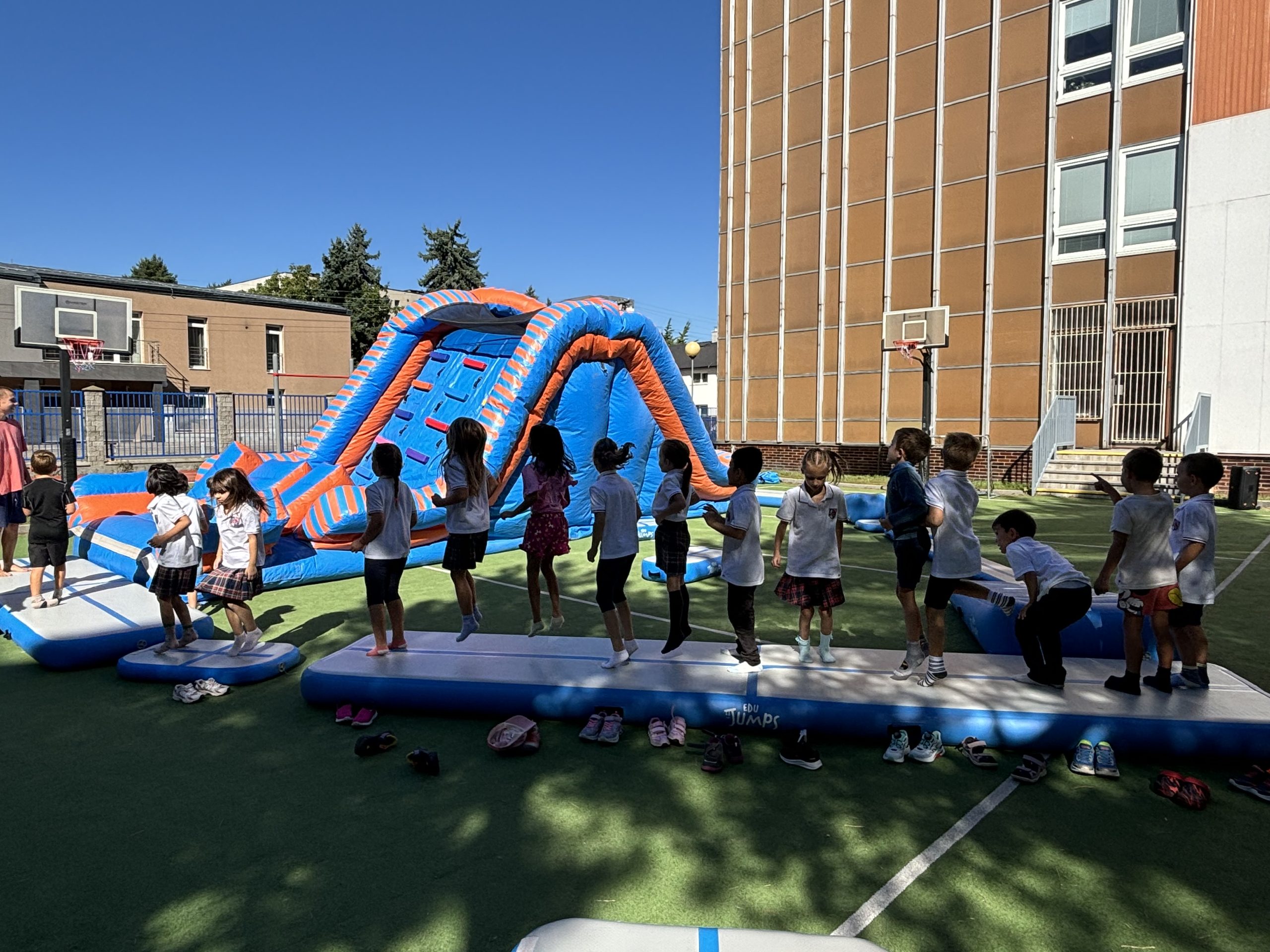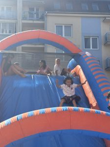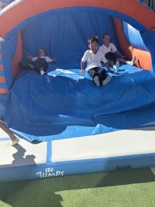 The back play area was transformed into an exciting adventure zone, filled with giant inflatable mats and a bounce slide. The children had an amazing time climbing, sliding, jumping, and cheering each other on.