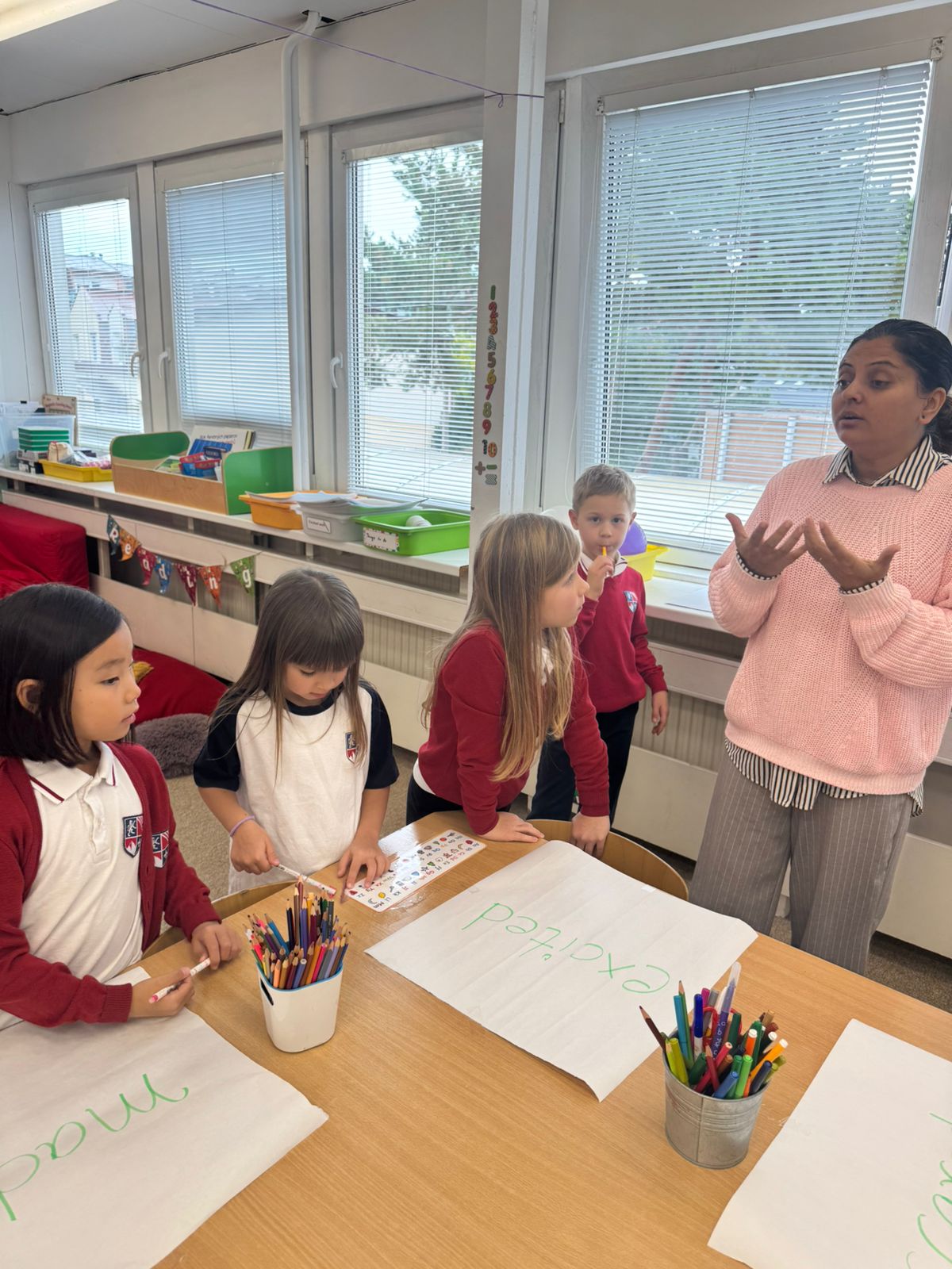 To explore, we tried a fun activity called Chalk Talk. Around the room, we placed big sheets of paper with different feeling words. Then, our little thinkers moved around, drawing pictures and writing their ideas right on the paper. Some chose to express through art, while others shared their thoughts in words and the classroom quickly filled with laughter, colour, and great conversations! ๐ŸŽจ๐Ÿ–๏ธ