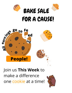 This Monday, join us for our community bake sale to help fund our mission of cooking and delivering meals to people in need. Every sweet treat you buy supports our youth-led team as we prepare and deliver affordable, home-cooked meals across town. Our vision is simple: feed more people, waste less, and make kindness a daily habit. Come grab a cookie, share a smile, and help us bake a difference!