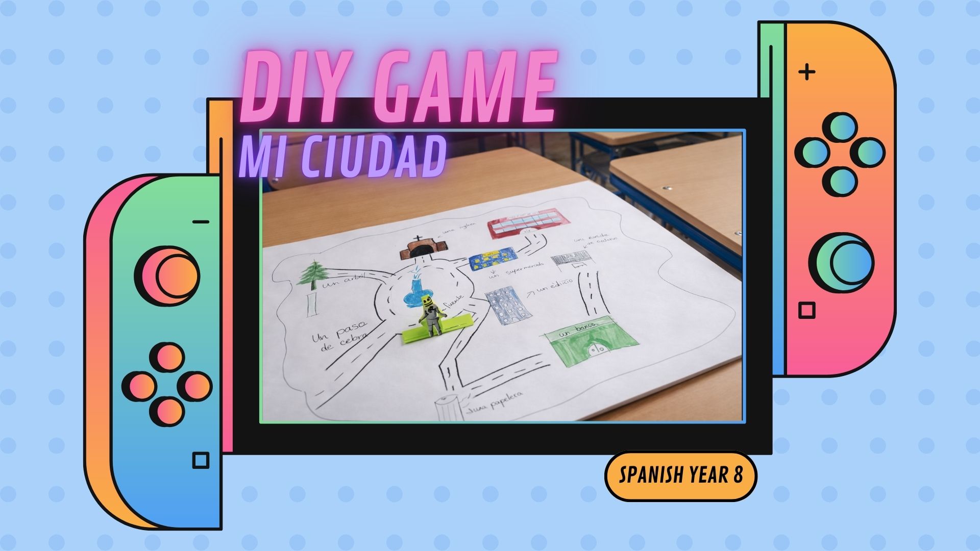 As part of an MYP2 Spanish project based learning unit, students completed a mini-project in which they designed and created a board game for the class to play. Using simple materials such as sticky notes, clips, paper, and magnets, students built a city map that served as the game board.