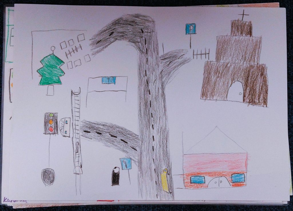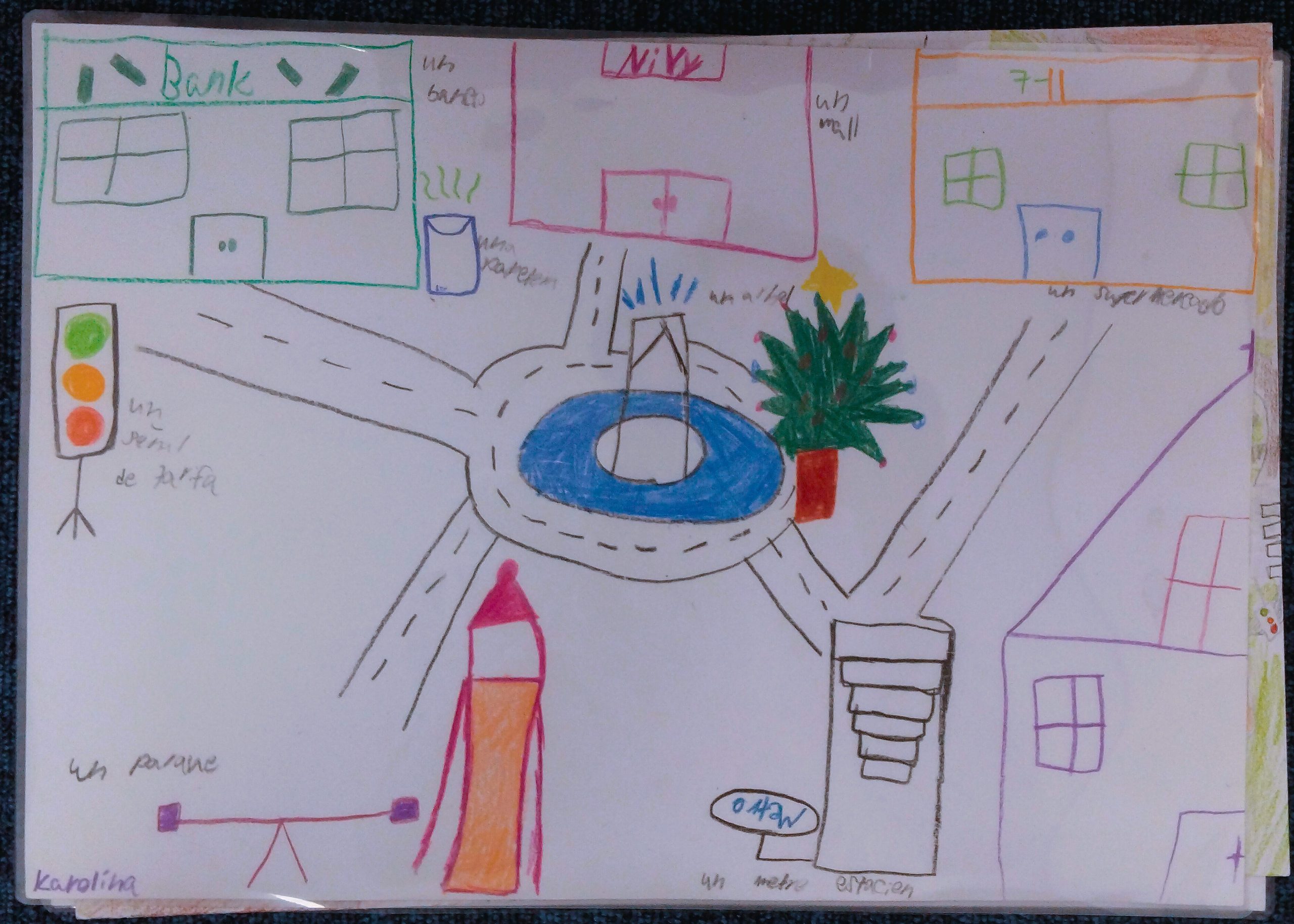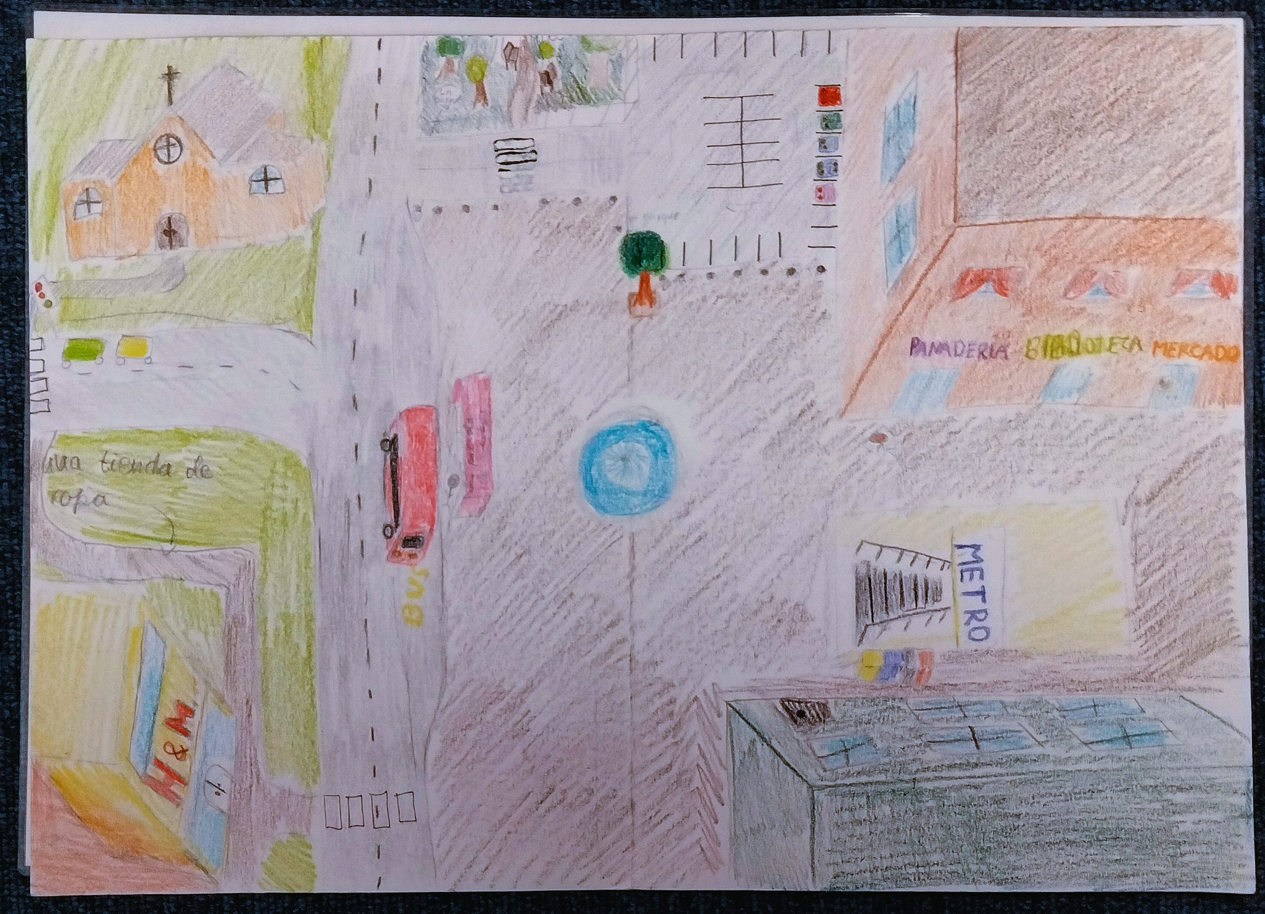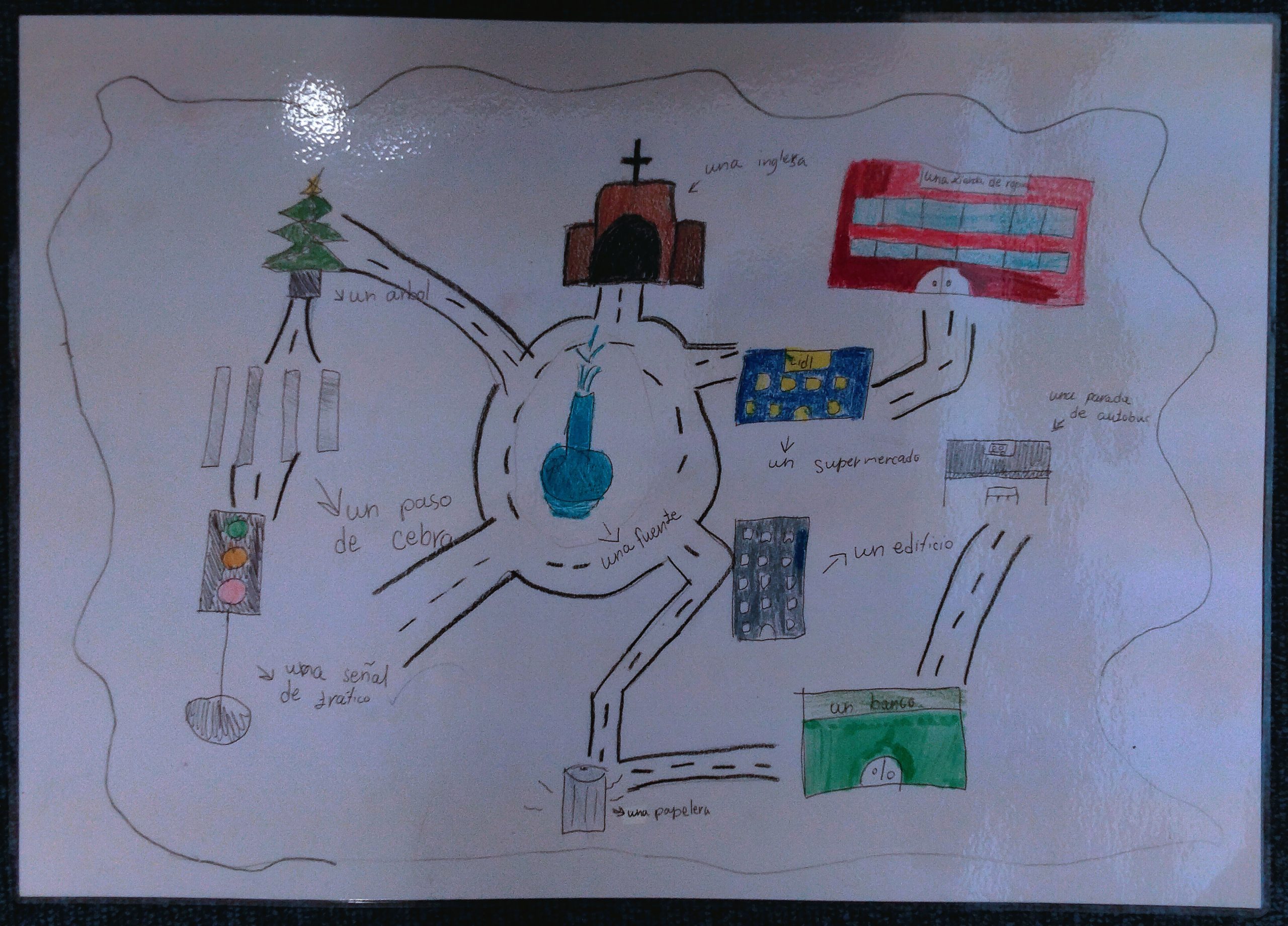 During the activity, each student presented their own city to the class and acted as the creator of the game. The creator asked the first player to locate a specific place on the map, using vocabulary related to the city and descriptive language. Once the place was identified, the creator asked questions about the size, color, or shape of the building, prompting the player to respond orally. The player then moved a small character on the map using a magnet to reach the correct location. In addition to developing linguistic skills, the project also integrated art and design skills. Students carefully designed their city maps using basic perspective, spatial organization, and visual clarity to help players navigate the board.