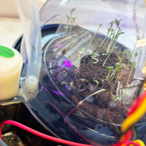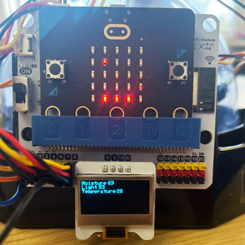 Using Micro:bit as a controller, they assembled the Elecfreaks Smart Greenhouse kit and program the system with MakeCode, They made use several inputs and outputs, including of a light sensor and a moisture sensor to respectively monitor and automatically regulate light level and soil moisture, with LED lights and a water pump watering system.