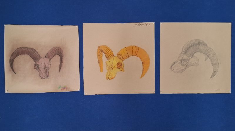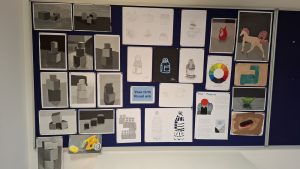 This was the first display of the semester, it’s a mix of fundamentals – monochrome cubes, color theory basics, still life basics, and experimentation with different media. Students are encouraged to work with a wide variety of media, as the art room features everything from paint, to a pottery wheel, and even stained glass supplies and glass.