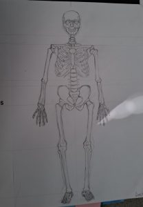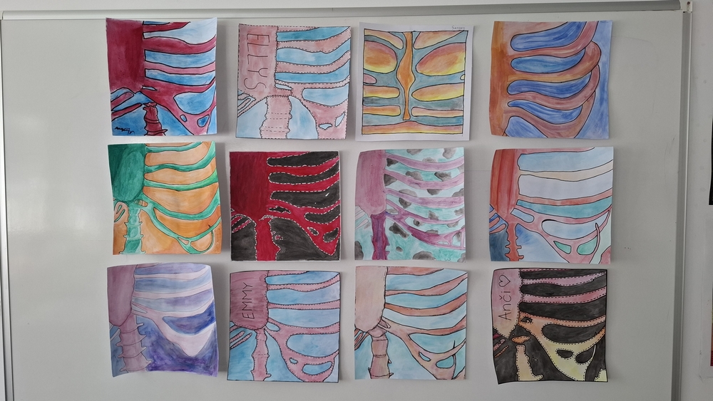 The students of year 10 have succesfully completed the anatomy unit in visual arts. The final task was to create a piece which consists of a background made out of unconventional materials, and 3 bones, each done in a different medium on top of it. This was the final project, and to achieve this, students had to complete countles smaller tasks, such as drawing a skeleton, working with charcoal, collage, and more.