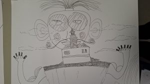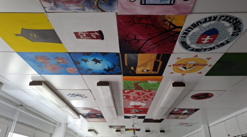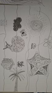 Every year, every class participates in several collaborative projects. The featured image is the art room ceiling, which is an ongoing project, and every year, that year’s year 10 adds new canvases to it during the ceiling painting unit. The 3 black and white fineliner images in this post are a result of an art activity, when each student has a paper, draws on it for a few minutes, and then passes it to the right, until at least 4 people worked on the same paper.