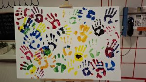 This painting features the hand prints of most EISB teachers, and it was done with acrylic paint on a foam board. Some teachers even got super creative, and instead of one solid color, they opted for various color combinations and gradients.