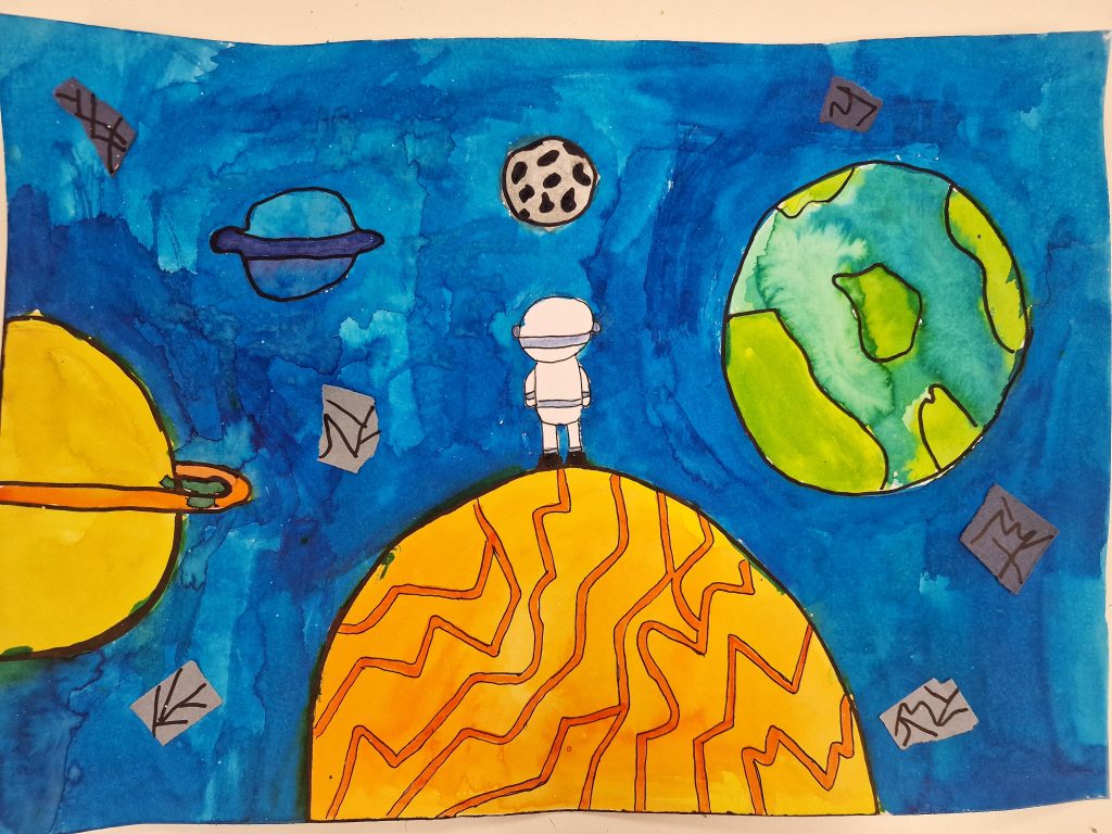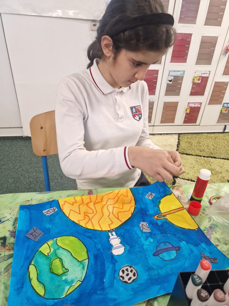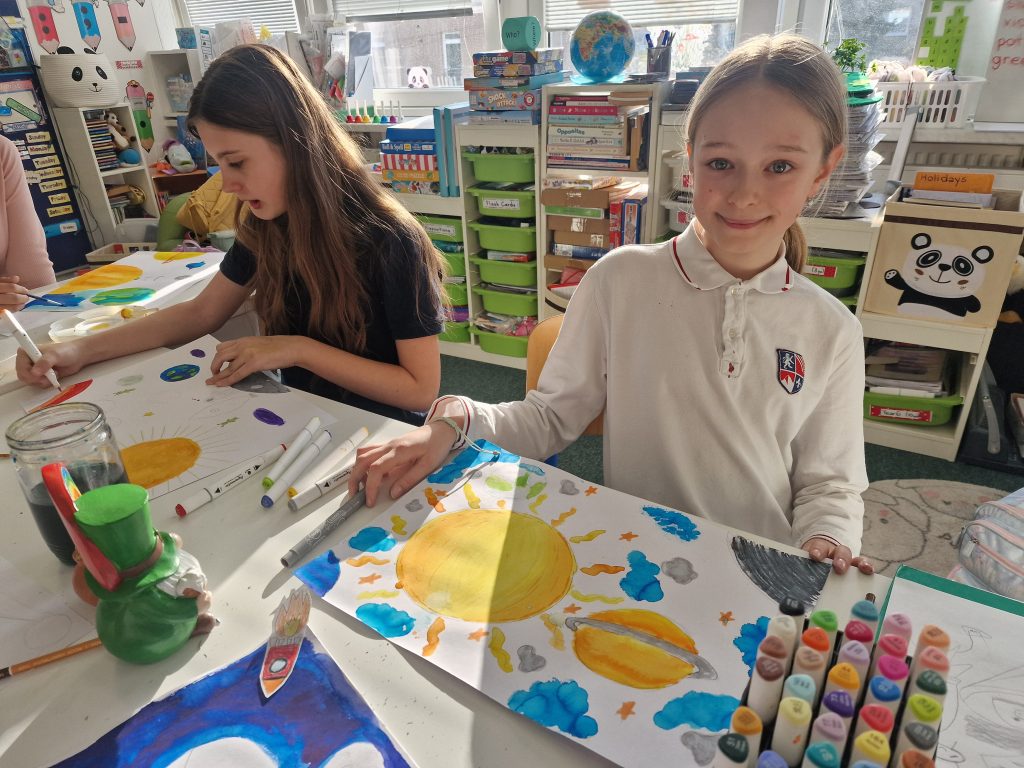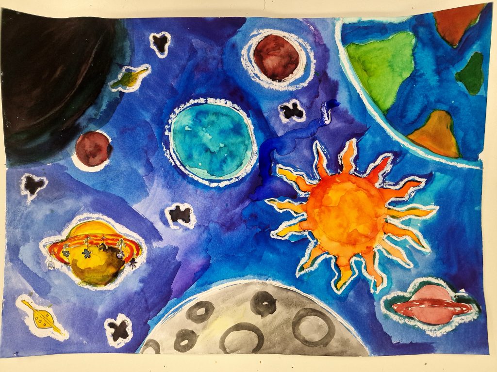 The task was to create a space-themed painting in A4 or A3 format using any art technique, except 3D. It took us two club sessions to complete our incredible artworks.
