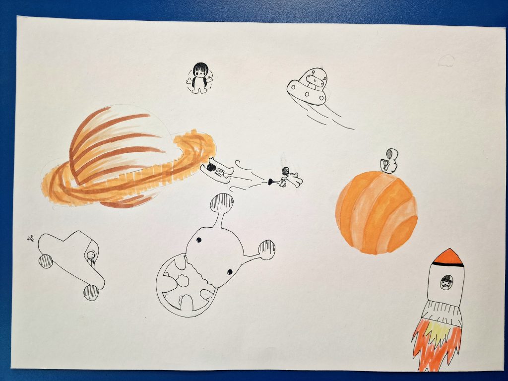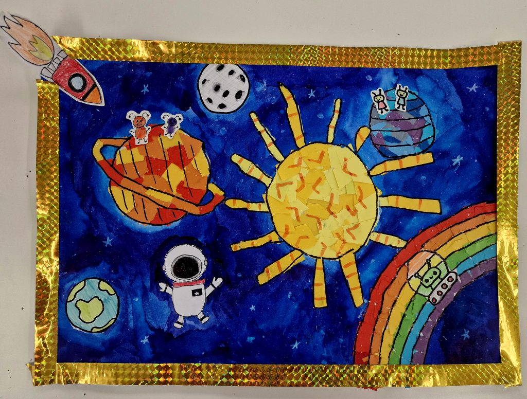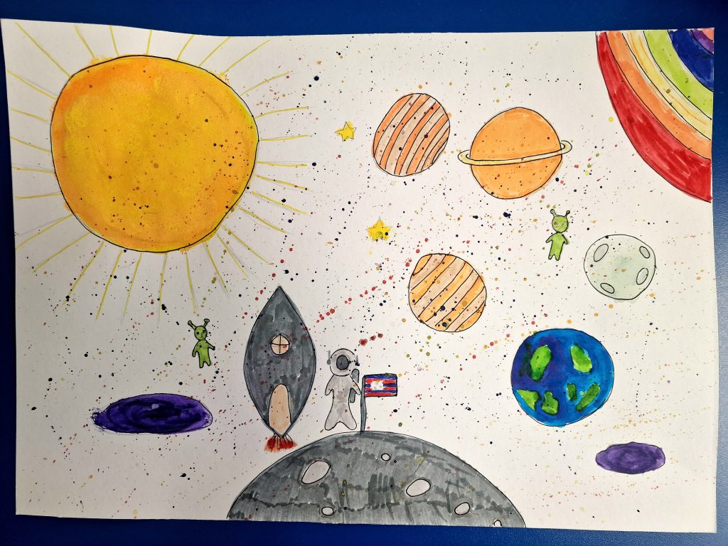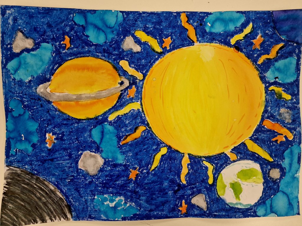 The task was to create a space-themed painting in A4 or A3 format using any art technique, except 3D. It took us two club sessions to complete our incredible artworks.
