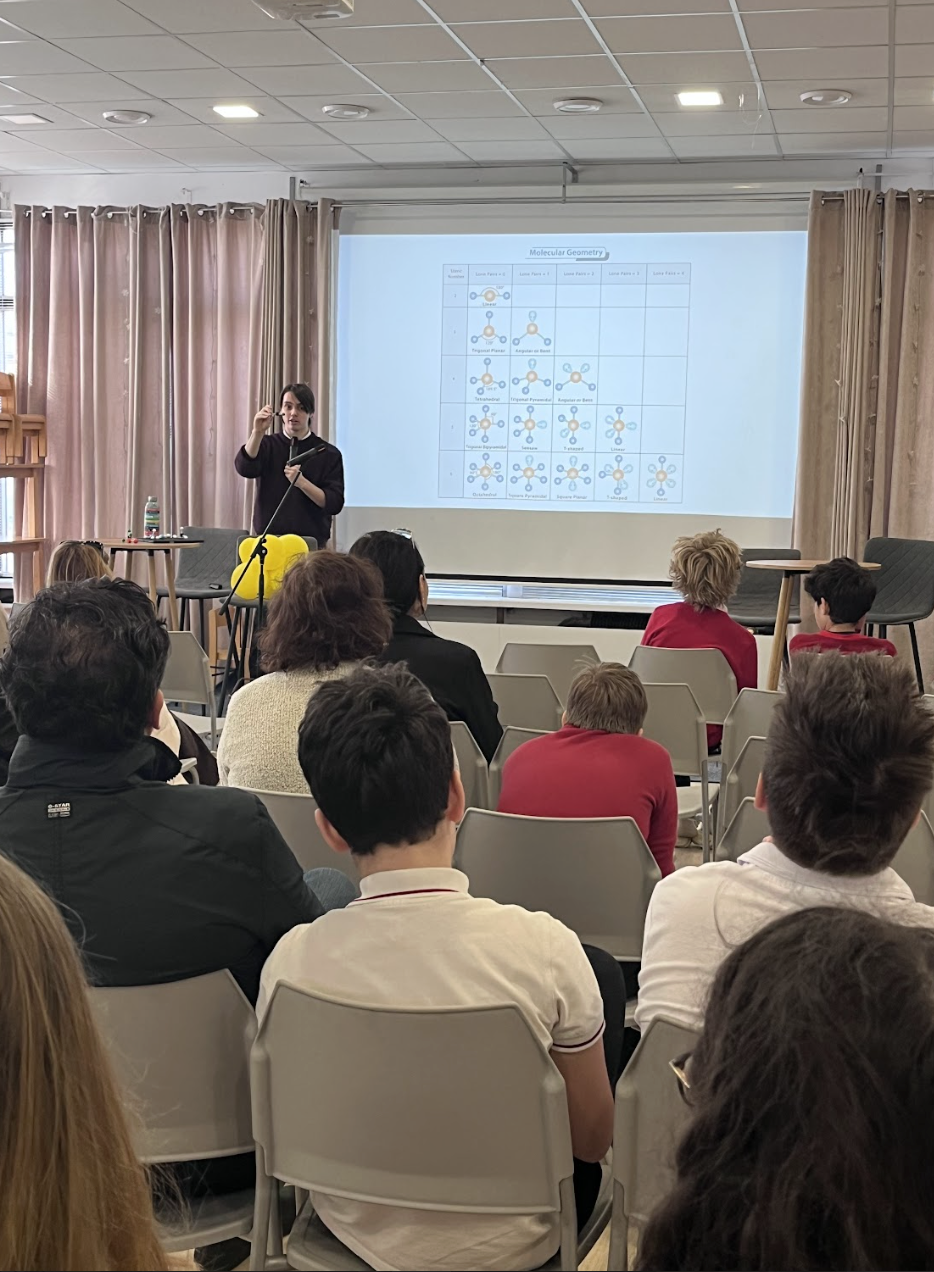 Our Open House presentation session in canteen started with an engaging performance of a bright DP 1 student Sviatoslav who gave visitors a glimpse into what studying chemistry in the Diploma Programme really looks like — and it was far more detailed than many expected!