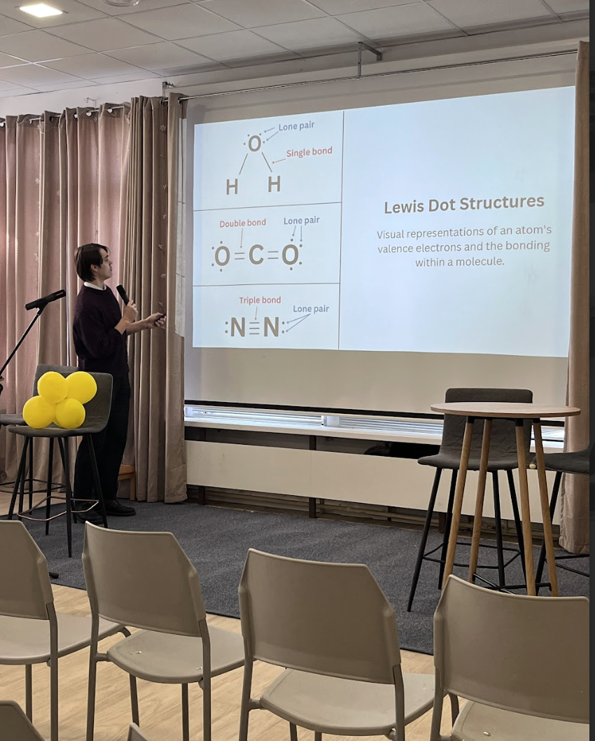 Sviatoslav introduced Lewis structures in a clear and accessible way, helping explain why the geometry of a molecule matters. Concepts such as polarity, dipole moment, solubility, and intermolecular forces were all brought into the discussion, showing both the complexity and real-world importance of chemistry.