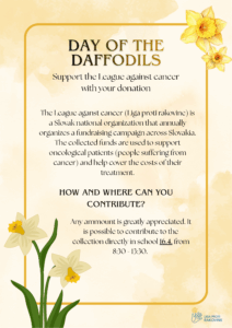 This Thursday, April 16th, Year 12 students will be hosting Day of the Daffodils (Deň Narcisov), an annual event in Slovakia dedicated to supporting oncological patients and individuals affected by cancer.
