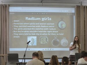 The students didn’t just stick to the science, they brought history to life by highlighting the cautionary tales of the early 20th century. They shared the tragic story of Eben Byers, whose “radium water” habit served as a grim wake-up call to the medical world.